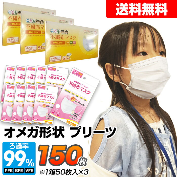 マスク 小さめ 150枚 子供用 オメガ形状 選べるパッケージ150枚または153枚セット プリーツ 不織布 3層構造フィルター 使い捨てマスク 不織布マスク 小顔用 ホワイト 白 ピンク 花粉 ほこり こども用マスク【送料無料】