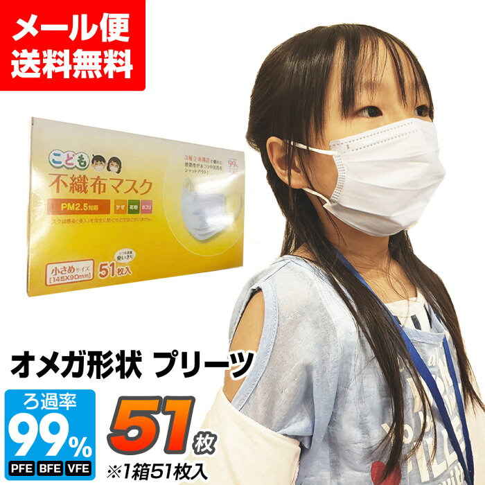 マスク 小さめ 50枚 +1枚 子供用 オメガ形状 プリーツ 不織布 3層構造フィルター 使い捨てマスク 不織布マスク 小顔用 プリーツ ホワイト 花粉 ほこり こども用マスク【送料無料】【メール便】