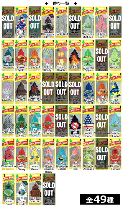 商品詳細商品名 Little Trees Air Freshenersディスプレイ付き96枚セット説明 アメリカで人気・知名度共にNO.1のエアフレッシュナー Little Treesのディスプレイセット!!フックが8本ついたディスプレイと、リトルツリー96枚セットです。